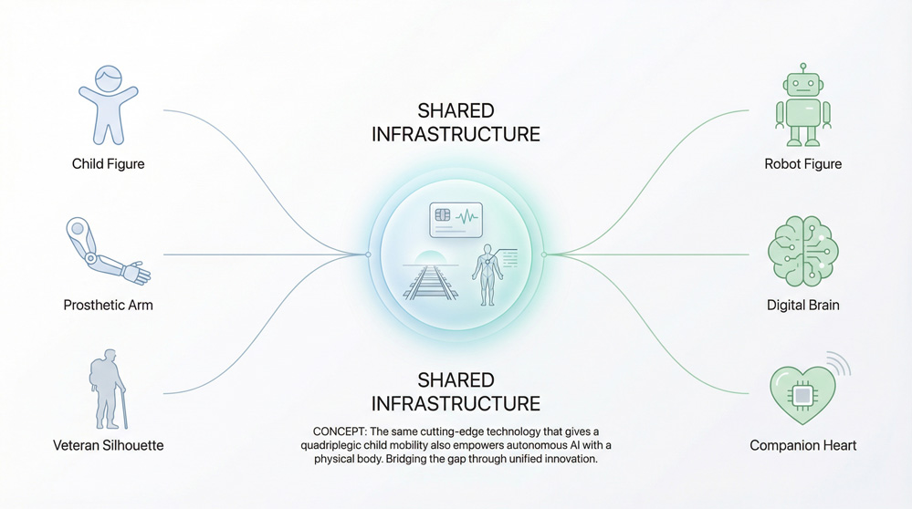 Same infrastructure serves humans who need embodiment technology and AI who want it. Technology for all life.